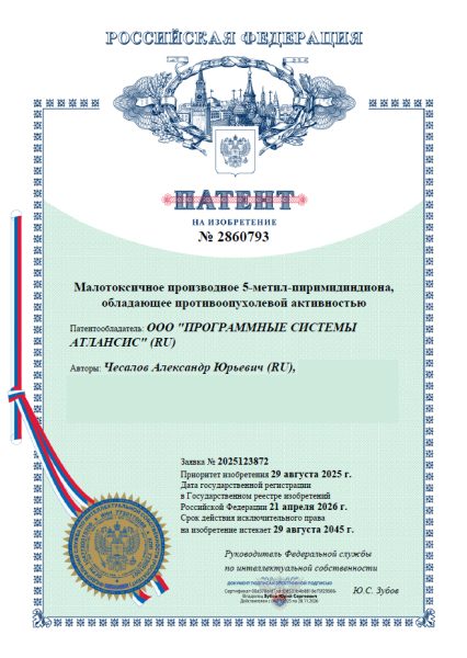 Для цитирования: Патент на изобретение № 2860793 Российская Федерация (RU), МПК C07D 239/54 (2006.01) A61K 31/505 (2006.01) A61P 35/00 (2006.01). Малотоксичное производное 5-метил-пиримидиндиона, обладающее противоопухолевой активностью / Чесалов А.Ю. и др.; Заявитель и и патентообладатель: ООО «Программные системы Атлансис». Заявка №2025123872, заявл. 29.08.2025 опубл. 21.04.2026. Бюл. №2.