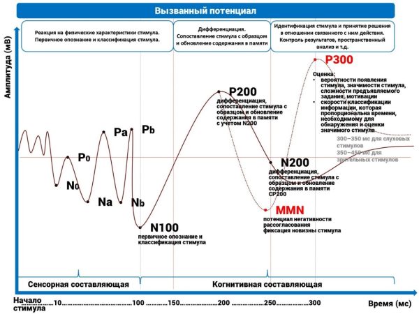 Вызванные потенциалы (представленные на рисунке 2), связанные с событиями, обладают стабильной и повторяемой формой сигнала, которая визуализируется в виде последовательности пиков. Положительные компоненты обозначаются буквой Р (например, Р100, Р200, Р300), а отрицательные — буквой N (например, N100, N200). Цифры в обозначениях указывают на латентный период (ЛП) пика, выраженный в миллисекундах.