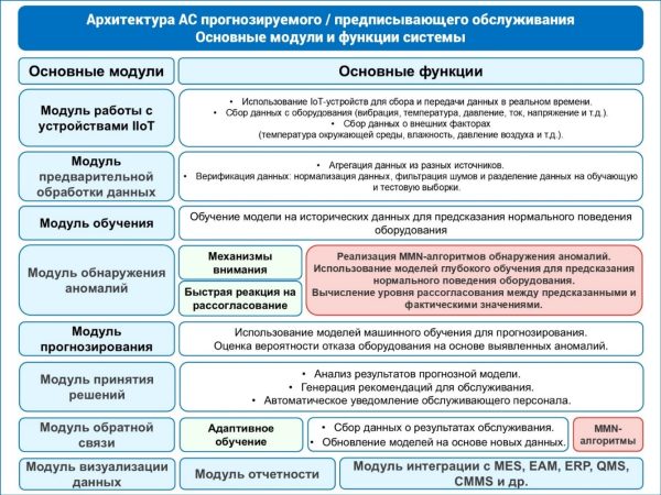 Таким образом автоматизированная система прогнозируемого или предписывающего обслуживания, включающая MMN-алгоритмы, должна поддерживать реализацию следующих модулей (функциональных подсистем) и основных функций: