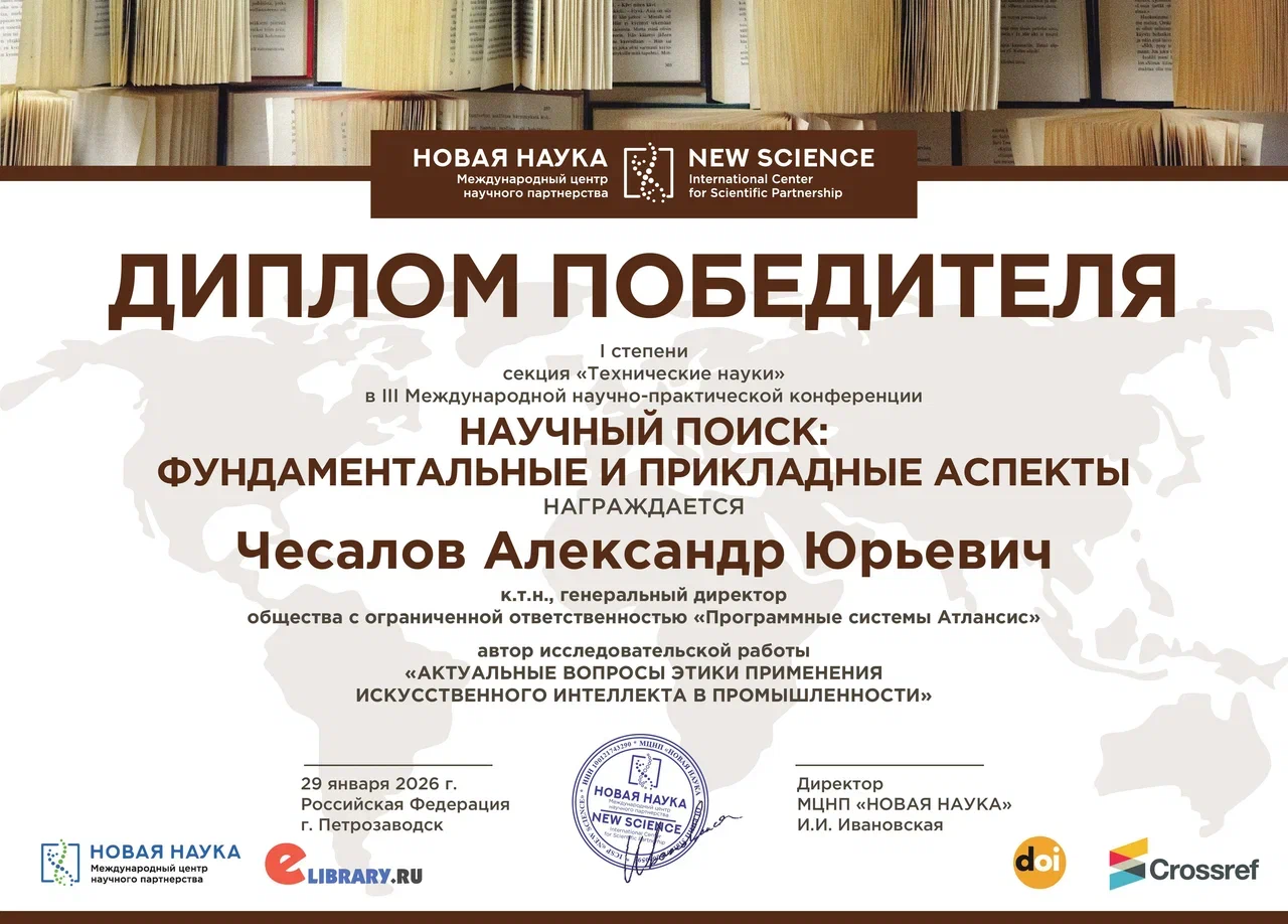Для цитирования: Чесалов А.Ю. Актуальные вопросы этики применения искусственного интеллекта в промышленности. // «Научный поиск: фундаментальные и прикладные аспекты» (2026, Петрозаводск): сборник статей III Международной научно-практической конференции (29 января 2026 г.). — Петрозаводск : МЦНП «НОВАЯ НАУКА», 2026. — С. 11-17. DOI 10.46916/02022026-6-978-5-00215-995-6